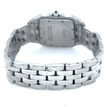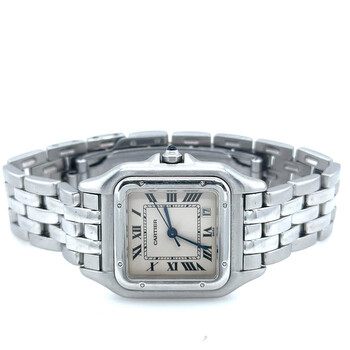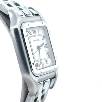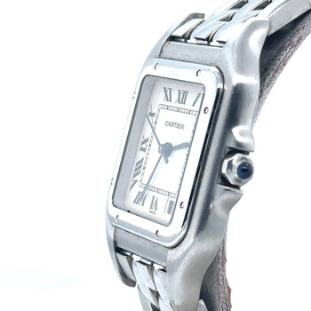 Silver-tone stainless steel case and bracelet. Fixed silver-tone stainless steel bezel. Silver-tone dial with blued-steel sword-shaped hands and Roman numeral hour markers. Minute scale around the inner rim. Dial Type: Analog. Quartz movement. Scratch resistant sapphire crystal. Pull / push crown. Solid case back. Square case shape, case size: 27 mm, case thickness: 7 mm. Band width: 15 mm, band length: 6 inches. Hidden clasp. Water resistant at 30 meters / 100 feet. Functions: hour, minute, second, date. Panthere Series. Luxury watch style. Watch label: Swiss Made. Pre-owned Cartier Panthere Quartz Silver Dial Ladies Watch 1310.