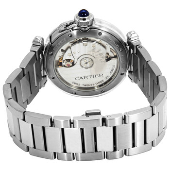 Silver-tone stainless steel case and bracelet. Fixed silver-tone stainless steel bezel. Silver dial with blue hands and index hour markers. Arabic numerals appear at the 3, 6, 9 and 12 o'clock positions. Minute markers around an inner ring. Dial Type: Analog. Luminescent markers. Cartier Calibre 1847 MC Automatic movement, containing 23 Jewels, bitting at 28800 vph, and has a power reserve of approximately 42 hours. Scratch resistant sapphire crystal. Screw down crown. Transparent case back. Round case shape, case size: 35 mm, case thickness: 9.37 mm. Deployment clasp. Water resistant at 100 meters / 330 feet. Functions: hour, minute, second. Pasha Series. Luxury watch style. Watch label: Swiss Made. Pre-owned Cartier Pasha Automatic Silver Dial Ladies Watch WSPA0013.