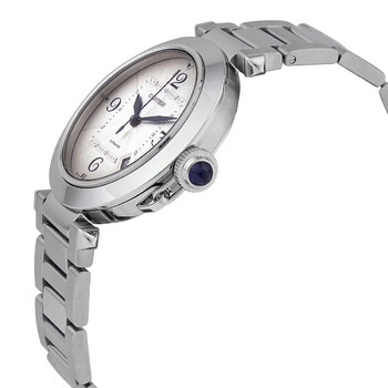 Pre-owned Silver-tone stainless steel case and bracelet. Fixed silver-tone stainless steel bezel. Silver dial with blue hands and index hour markers. Arabic numerals appear at the 3, 6, 9 and 12 o'clock positions. Minute markers around an inner ring. Dial Type: Analog. Date display between the 4 and 5 o'clock positions. Cartier Calibre 1847 MC Automatic movement, containing 23 Jewels, bitting at 28800 vph, and has a power reserve of approximately 42 hours. Scratch resistant sapphire crystal. Screw down crown. Transparent case back. Round case shape, case size: 41 mm, case thickness: 9.55 mm. Band width: 22 mm. Deployment clasp. Water resistant at 100 meters / 330 feet. Functions: date, hour, minute, second. Pasha Series. Luxury watch style. Watch label: Swiss Made. Cartier Pasha Automatic Silver Dial Men's Watch WSPA0009.