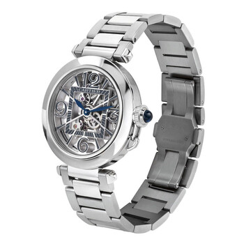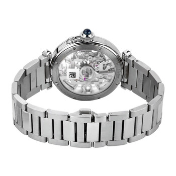 Pre-owned Silver-tone stainless steel case and bracelet. Fixed silver-tone stainless steel bezel. Transparent dial with blued-steel sword-shaped hands and Arabic numeral & index hour markers. Minute scale around the inner rim. Dial Type: Analog. Cartier Calibre 9624 MC Automatic movement, containing 28 Jewels, composed of 172 parts, bitting at 28800 vph, and has a power reserve of approximately 48 hours. Scratch resistant sapphire crystal. Pull / push crown. Transparent case back. Round case shape, case size: 41 mm, case thickness: 11 mm. Band width: 21 mm, band length: 7.75 inches. Deployment with push button release clasp. Water resistant at 30 meters / 100 feet. Functions: hour, minute, second. Pasha Series. Luxury watch style. Watch label: Swiss Made. Cartier Pasha Automatic Men's Watch WHPA0007.