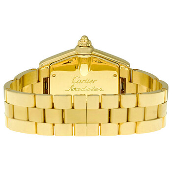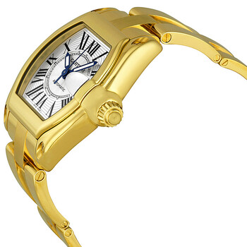 Yellow gold-tone 18kt yellow gold case and bracelet. Fixed yellow gold-tone 18kt yellow gold bezel. Silver dial with luminscent sword-shaped blued steel hands and black Roman numeral hour markers, minute markers around an inner ring hour markers. Dial Type: Analog. Luminescent hands and markers. Date display at the 3 o'clock position. Cartier Calibre 3110 Automatic movement, based upon ETA 2892-2, containing 21 Jewels, bitting at 28800 vph, and has a power reserve of approximately 42 hours. Scratch resistant sapphire crystal. Solid case back. Tonneau case shape, case size: 44 mm x 37 mm, case thickness: 10.2 mm. Hidden deployment clasp. Water resistant at 100 meters / 330 feet. Functions: date, hour, minute, second. Roadster Series. Luxury watch style. Watch label: Swiss Made. Pre-owned Cartier Roadster Automatic Silver Dial Men's Watch W62005V1.