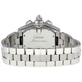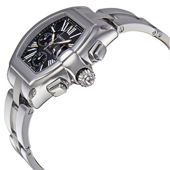 Silver-tone stainless steel case and bracelet. Fixed silver-tone bezel. Black dial with luminous hands and Roman numeral hour markers, munute markers on the outer rim hour markers. Dial Type: Analog. Luminescent hands and dial markers. Magnified date display at the 3 o'clock position. Chronograph - three sub-dials displaying: 60 second, 30 minute and 12 hour. Automatic movement. Scratch resistant sapphire crystal. Screw down crown. Stainless steel case back. Tonneau case shape, case size: 49 mm x 43 mm, case thickness: 13 mm. Hidden deployment clasp. Water resistant at 100 meters / 330 feet. Functions: hours, minutes, seconds, date, chronograph. Roadster Series. Luxury watch style. Watch label: Swiss Made. Pre-owned Cartier Roadster Chronograph Black Dial Men's Watch W62020X6.