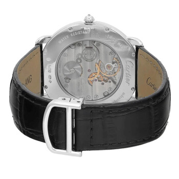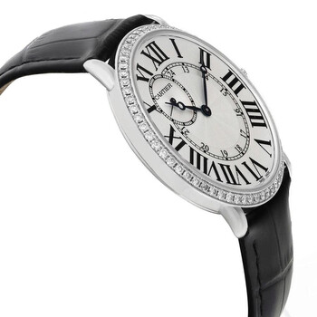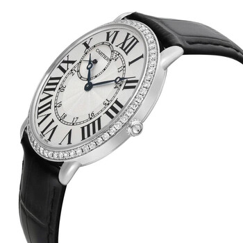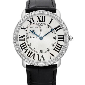Grey 18kt white gold case with a black leather strap. Fixed 18kt white gold bezel with diamond set. Silver dial with blued-steel apple-shaped hands and black Roman numeral hour markers. Minute markers around an inner ring with 24 hour scale. Dial Type: Analog. One subdial displaying: small second at the 10 o'clock position. Cartier Calibre 9754 MC hand wind movement. Scratch resistant sapphire crystal. Crown set with a diamond crown. Skeleton case back. Round case shape, case size: 42 mm, case thickness: 7.25 mm. Band width: 18 mm, band length: 7.5 inches. Fold over clasp with a safety release. Water resistant at 30 meters / 100 feet. Functions: GMT, second time zone, hour, minute, second. Ronde Louis Cartier Series. Luxury watch style. Watch label: Swiss Made. Pre-owned Cartier Ronde Louis Cartier GMT Diamond Silver Dial Men's Watch WR007002.