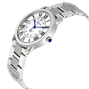 Stainless steel case with a stainless steel bracelet. Fixed stainless steel bezel. Silver opaline dial with blue hands and Roman numeral hour markers. 24 hour markers. Minute markers around the inner ring. Dial Type: Analog. Automatic movement with a 42-hour power reserve. Scratch resistant sapphire crystal. Pull / push crown. Solid case back. Case size: 36 mm. Case thickness: 9.46 mm. Round case shape. Deployment clasp. Water resistant at 30 meters / 100 feet. Functions: hour, minute, second, 24 hour. Luxury watch style. Watch label: Swiss Made. Cartier Ronde Solo Silver Opaline Ladies Watch WSRN0012.