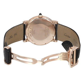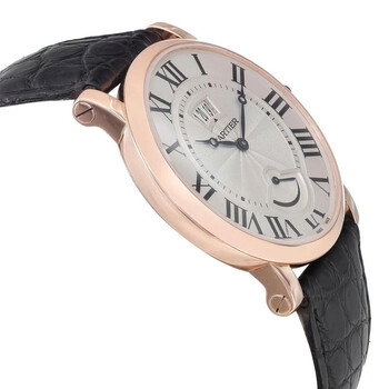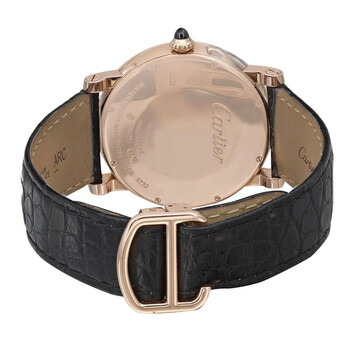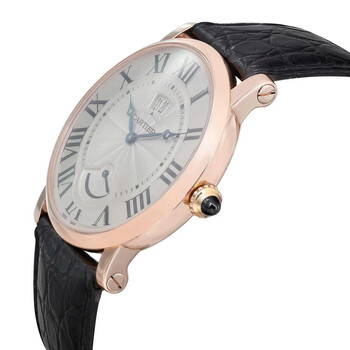 Pre-owned 18kt rose gold case with a brown (alligator) leather strap. Fixed 18kt rose gold bezel. Silver dial with blued-steel sword-shaped hands and Roman numeral hour markers. Minute markers around the inner ring. Dial Type: Analog. Date display below the 12 o'clock position. Power reserve indicator. Cartier calibre 9348 MC hand wind movement with a 192-hour / 8-day power reserve. Scratch resistant sapphire crystal. Pull / push with synthetic sapphire cabochon crown. Solid case back. Round case shape. Case size: 40 mm. Case thickness: 8.94 mm. Band width: 22 mm. Cartier deployment clasp. Water resistant at 30 meters / 100 feet. Functions: date, hour, minute, second. Rotonde De Cartier Series. Luxury watch style. Watch label: Swiss Made. Cartier Rotonde de Cartier Silver Dial 18kt Rose Gold Men's Watch W1556252.