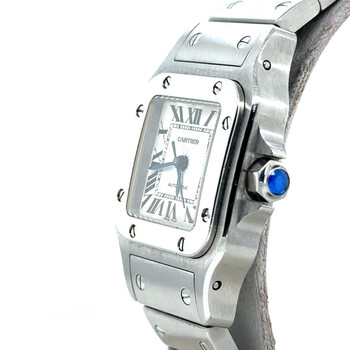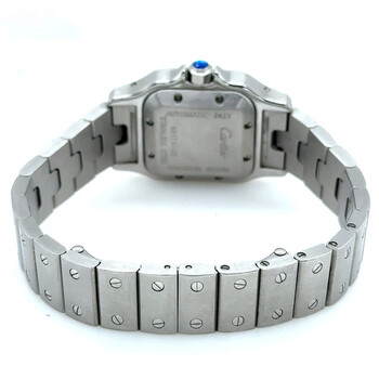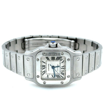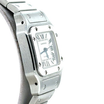 Silver-tone stainless steel case and bracelet. Fixed silver-tone stainless steel bezel. Silver-tone dial with blued-steel sword-shaped hands and Roman numeral hour markers. Minute scale around the inner rim. Dial Type: Analog. Automatic movement. Scratch resistant sapphire crystal. Pull / push crown. Solid case back. Square case shape, case size: 24 mm, case thickness: 9 mm. Band width: 13.5 mm. Hidden clasp. Water resistant at 30 meters / 100 feet. Functions: hour, minute. Santos Galbee Series. Luxury watch style. Watch label: Swiss Made. Pre-owned Cartier Santos Galbee Automatic Silver Dial Ladies Watch W20054D6.
