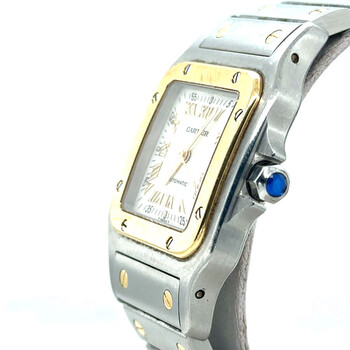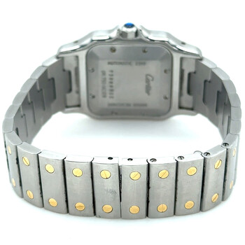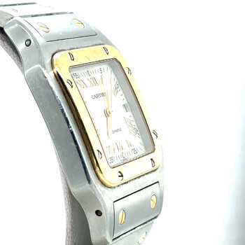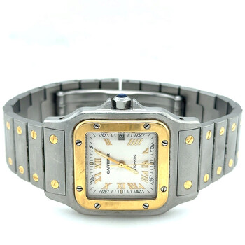 Silver-tone stainless steel case with a two-tone (silver-tone and yellow gold-tone) 18kt yellow gold and stainless steel bracelet. Fixed yellow gold-tone 18kt yellow gold bezel. Silver-tone dial with yellow gold-tone hands and Roman numeral hour markers. Minute markers around the outer rim. Dial Type: Analog. Date display at the 3 o'clock position. Automatic movement. Scratch resistant sapphire crystal. Pull / push crown. Solid case back. Square case shape, case size: 29 mm, case thickness: 8 mm. Band width: 18 mm. Hidden clasp. Water resistant at 30 meters / 100 feet. Functions: date, hour, minute, second. Santos Galbee Series. Luxury watch style. Watch label: Swiss Made. Pre-owned Cartier Santos Galbee Automatic Silver Dial Unisex Watch W20041C4.