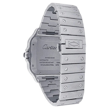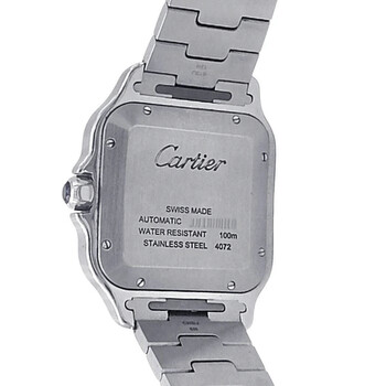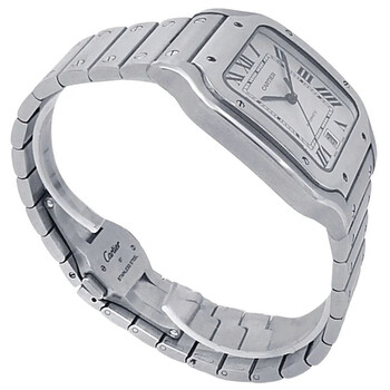 Pre-owned Stainless steel case with a stainless steel bracelet. Fixed stainless steel bezel. Silvered opaline dial with blued-steel sword-shaped hands and black Roman numeral hour markers. Minute markers around an inner ring. Dial Type: Analog. Date display at the 6 o'clock position. Cartier calibre 1847 MC automatic movement, containing 23 Jewels, bitting at 28800 vph, and has a power reserve of approximately 42 hours. Scratch resistant sapphire crystal. Blue cabochoon crown. Solid case back. Square case shape. Case dimensions: 39.8 mm x 47.5 mm. Case thickness: 9.08 mm. Deployment clasp. Water resistant at 100 meters / 330 feet. Functions: date, hour, minute, second. Santos Series. Luxury watch style. Watch label: Swiss Made. Cartier Santos Silvered Opaline Dial Men's Watch WSSA0018.
