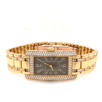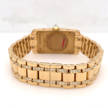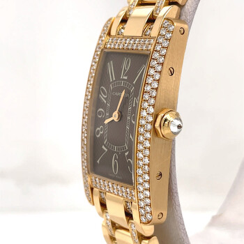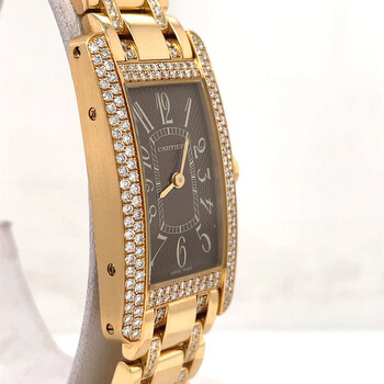 Yellow gold-tone 18kt yellow gold case with a yellow gold-tone diamond set 18kt yellow gold bracelet. Fixed yellow gold-tone bezel with diamond set 18kt yellow gold. Brown dial with yellow gold-tone hands and Arabic numeral hour markers. Minute scale around the inner rim. Dial Type: Analog. Quartz movement. Scratch resistant sapphire crystal. Pull / push crown. Solid case back. Rectangle case shape, case size: 19 mm, case thickness: 7 mm. Band width: 13 mm. Hidden clasp. Water resistant at 30 meters / 100 feet. Functions: hour, minute. Tank Americaine Series. Luxury watch style. Watch label: Swiss Made. Pre-owned Cartier Tank Americaine Quartz Diamond Brown Dial Ladies Watch 2482.