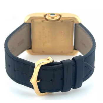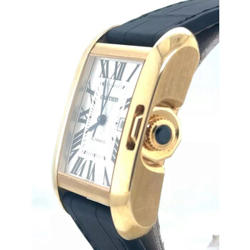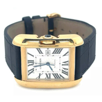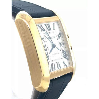 Yellow gold-tone 18kt yellow gold case with a black leather strap. Fixed yellow gold-tone 18kt yellow gold bezel. Silver dial with blue hands and Roman numeral hour markers. Minute markers around the inner ring. Dial Type: Analog. Date display at the 3 o'clock position. Cartier Calibre 1904 MC automatic movement with a 48-hour power reserve. Scratch resistant sapphire crystal. Transparent sapphire case back. Rectangle case shape, case size: 47 mm x 36.2 mm, case thickness: 9.82 mm. Deployment clasp. Water resistant at 30 meters / 100 feet. Functions: date, hour, minute, second. Tank Anglaise Large Series. Luxury watch style. Watch label: Swiss Made. Pre-owned Cartier Tank Anglaise Large Silver Dial Men's Watch W5310032.