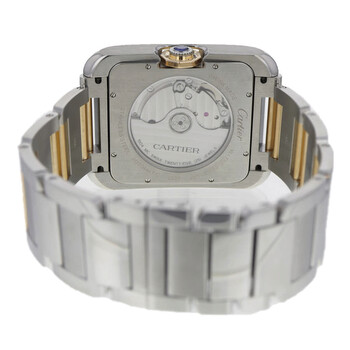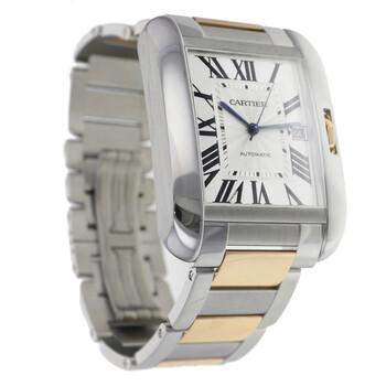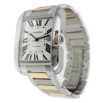 Silver-tone stainless steel case with a two-tone (silver-tone and rose gold-tone) stainless steel and 18kt rose gold bracelet. Fixed silver-tone stainless steel bezel. Silver-tone dial with blued-steel sword-shaped hands and Roman numeral hour markers. Minute scale around the inner rim. Dial Type: Analog. Date display at the 3 o'clock position. Cartier Calibre 1904 MC automatic movement with a 48-hour power reserve. Scratch resistant sapphire crystal. Cabochon crown. Transparent see through case back. Rectangle case shape, case size: 36.47 mm. Fold over clasp with a safety release. Water resistant at 30 meters / 100 feet. Functions: date, hour, minute, second. Tank Anglaise Xl Series. Luxury watch style. Watch label: Swiss Made. Item Variations: 3507. Pre-owned Cartier Tank Anglaise XL Automatic Silver Dial Men's Watch W5310006.