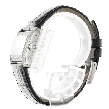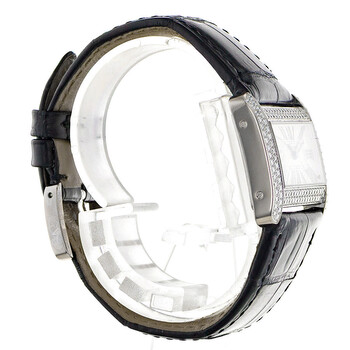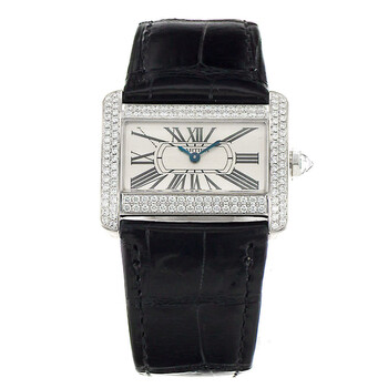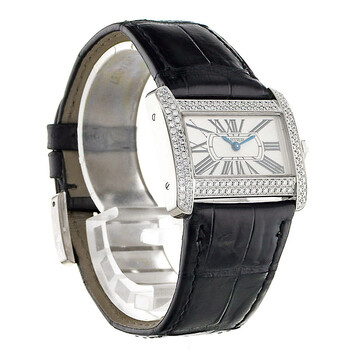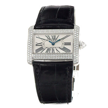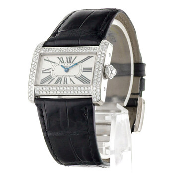 18kt white gold case with a black leather strap. Fixed bezel with diamond set 18kt white gold. Silver-tone dial with blued-steel sword-shaped hands and Roman numeral hour markers. Dial Type: Analog. Quartz movement. Scratch resistant sapphire crystal. Rectangle case shape, case size: 31 mm. Buckle clasp. Functions: hour, minute. Tank Divan Series. Luxury watch style. Watch label: Swiss Made. Item Variations: 2613. Pre-owned Cartier Tank Divan Quartz Diamond Silver Dial Men's Watch WA301236.