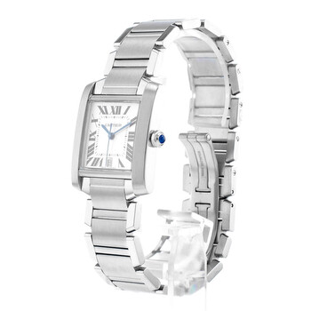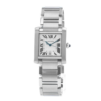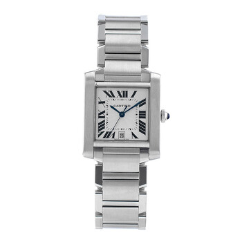 Silver-tone stainless steel case and bracelet. Fixed silver-tone stainless steel bezel. Silver-tone dial with blued-steel sword-shaped hands and Roman numeral hour markers. Minute scale around the inner rim. Dial Type: Analog. Date display at the 6 o'clock position. Cartier Calibre 120 Automatic movement, based upon ETA 2000-1, containing 33 Jewels, bitting at 28800 vph, and has a power reserve of approximately 40 hours. Scratch resistant sapphire crystal. Cabochon crown. Solid case back. Rectangle case shape, case size: 32 mm x 28.15 mm. Fold over clasp with a safety release. Water resistant at 30 meters / 100 feet. Functions: date, hour, minute, second. Tank Francaise Series. Luxury watch style. Watch label: Swiss Made. Item Variations: 2302, W51002Q3, Cartier-W51002Q3. Pre-owned Cartier Tank Francaise Automatic Silver Dial Men's Watch W51002Q3.