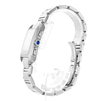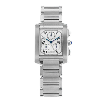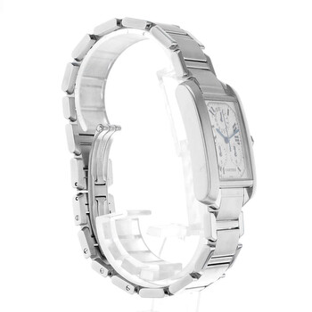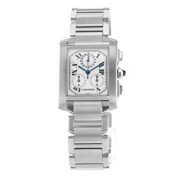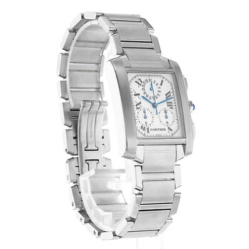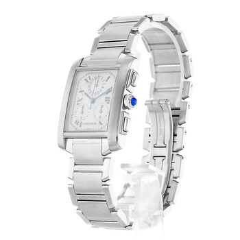 Silver-tone stainless steel case and bracelet. Fixed silver-tone stainless steel bezel. Silver-tone dial with blued-steel sword-shaped hands and Roman numeral hour markers. Minute markers around the outer rim. Dial Type: Analog. Date display at the 12 o'clock position. Quartz movement. Cabochon crown. Rectangle case shape, case size: 28 mm. Fold over clasp with a safety release. Functions: chronograph, date, hour, minute, second. Tank Francaise Series. Luxury watch style. Watch label: Swiss Made. Item Variations: 2303. Pre-owned Cartier Tank Francaise Chronograph Quartz Silver Dial Men's Watch W51001Q3.