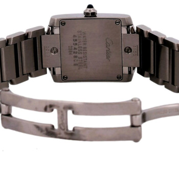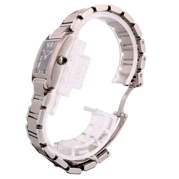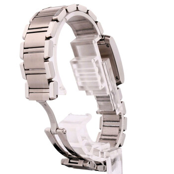 Silver-tone stainless steel case and bracelet. Fixed silver-tone stainless steel bezel. Black dial with silver-tone hands and Roman numeral hour markers. Minute scale around the inner rim. Dial Type: Analog. Quartz movement. Scratch resistant sapphire crystal. Pull / push crown. Solid case back. Square case shape, case size: 18 mm. Band length: 5.5 inches. Fold over clasp with a safety release. Functions: hour, minute. Tank Francaise Series. Luxury watch style. Watch label: Swiss Made. Pre-owned Cartier Tank Francaise Quartz Black Dial Men's Watch W51026Q3.
