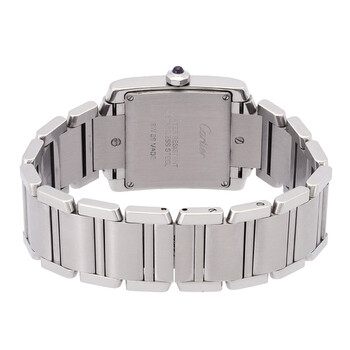 Silver-tone stainless steel case and bracelet. Fixed silver-tone stainless steel set with diamonds bezel. Silver dial with blued-steel sword-shaped hands and Roman numeral hour markers. Minute markers around an inner ring. Dial Type: Analog. Quartz movement. Scratch resistant sapphire crystal. Pull / push set with blue sapphire cabochon crown. Solid case back. Square case shape, case size: 25 mm x 30 mm, case thickness: 6.7 mm. Band length: 5 3/4 inches. Hidden fold over clasp. Water resistant at 30 meters / 100 feet. Functions: hour, minute. Additional Info: bezel set with 26 diamonds (0.62 carats). Tank Francaise Series. Luxury watch style. Watch label: Swiss Made. Pre-owned Cartier Tank Francaise Silver Dial Ladies Watch W4TA0009.