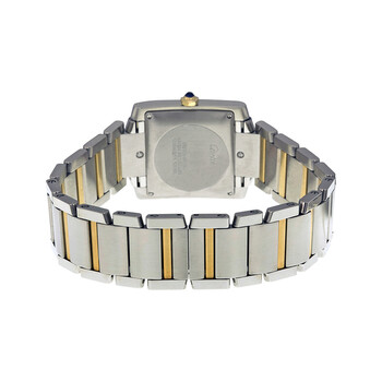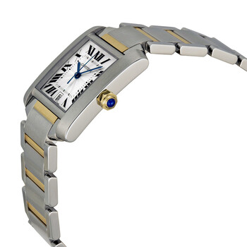 Pre-owned Stainless steel case with a stainless steel bracelet with 18kt yellow gold bars. Fixed stainless steel bezel. Silver grained dial with blue hands and Roman numeral hour markers. Minute markers around an inner ring. Dial Type: Analog. Luminescent hands and dial markers. Date display at the 6 o'clock position. Automatic movement. Scratch resistant sapphire crystal. 18kt yellow gold octagonal crown. Solid case back. Case size: 28 mm x 32 mm. Case thickness: 7.5 mm. Rectangle case shape. Hidden deployment clasp. Water resistant at 30 meters / 100 feet. Functions: hour, minute, second, date. Luxury watch style. Watch label: Swiss Made. Item Variations: W51005Q4, Cartier-W51005Q4. Cartier Tank Francaise 18kt Yellow Gold and Steel Men's Watch W51005Q4.