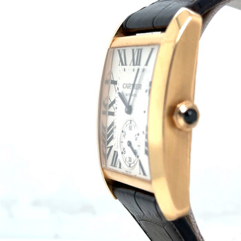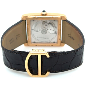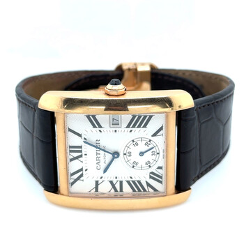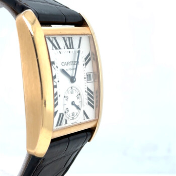 Rose gold-tone 18kt pink gold case with a black leather strap. Fixed rose gold-tone 18kt pink gold bezel. Silver flinque dial with blued-steel sword-shaped hands and black Roman numeral hour markers. Minute markers around an inner ring. Dial Type: Analog. Date display at the 3 o'clock position. One subdial displaying: small seconds. Cartier Calibre 1904-PS MC Automatic movement, containing 27 Jewels, bitting at 28800 vph, and has a power reserve of approximately 48 hours. Scratch resistant sapphire crystal. Pull / push crown. Transparent case back. Rectangle case shape, case size: 44 mm x 34.3 mm, case thickness: 9.5 mm. Band width: 22 mm. Fold over clasp. Water resistant at 30 meters / 100 feet. Functions: date, hour, minute, small second. Tank Mc Series. Luxury watch style. Watch label: Swiss Made. Pre-owned Cartier Tank Mc Silver Flinque Dial Men's Watch W5330001.