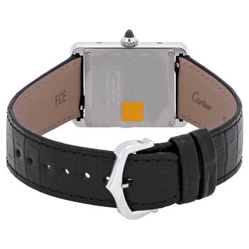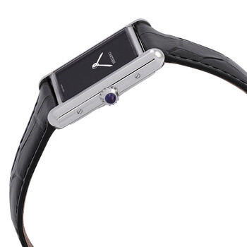 Pre-owned Silver-tone stainless steel case with a black alligator leather strap. Fixed silver-tone stainless steel bezel. Black dial with silver-tone hands. Dial Type: Analog. Quartz movement. Scratch resistant sapphire crystal. Cabochon crown. Solid case back. Rectangle case shape, case size: 33.7mm x 25.5mm, case thickness: 6.6 mm. Buckle clasp. Water resistant at 30 meters / 100 feet. Functions: hour, minute. Tank Must Series. Luxury watch style. Watch label: Swiss Made. Cartier Tank Must Quartz Black Dial Ladies Watch WSTA0072.
