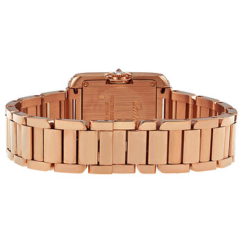 Pre-owned 18kt rose gold case with a 18kt rose gold bracelet. Fixed 18kt rose gold bezel set with diamonds. Silver dial with sword shaped blue steel hands and Roman numeral hour markers. Minute markers. Dial Type: Analog. Quartz movement. Scratch resistant sapphire crystal. Set with diamond crown. Solid case back. Case dimensions: 30.2 mm x 22.7 mm. Case thickness: 7.19 mm. Rectangle case shape. Hidden folding clasp. Water resistant at 30 meters / 100 feet. Functions: hours, minutes and seconds. Luxury watch style. Watch label: Swiss Made. Cartier Tank Anglaise Silver Dial 18kt Rose Gold Diamond Ladies Watch WT100002.