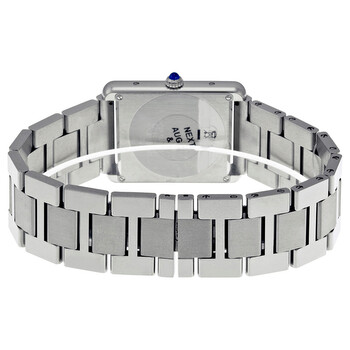 Pre-owned Stainless steel case with a stainless steel bracelet. Fixed stainless steel bezel. Pale silvered opaline dial with blued-steel sword-shaped hands and black Roman numeral hour markers. Minute markers around an inner ring. Dial Type: Analog. Cartier calibre 690 quartz movement. Scratch resistant sapphire crystal. Pull / push set with a synthetic spinal cabochon crown. Solid case back. Rectangle case shape. Case dimensions: 34.8 mm x 27.4 mm. Case thickness: 5.55 mm. Band width: 20 mm. Hidden fold over clasp. Water resistant at 30 meters / 100 feet. Functions: hour, minute. Tank Solo Series. Luxury watch style. Watch label: Swiss Made. Cartier Tank Solo Silvered Opaline Dial Large Watch W5200014.