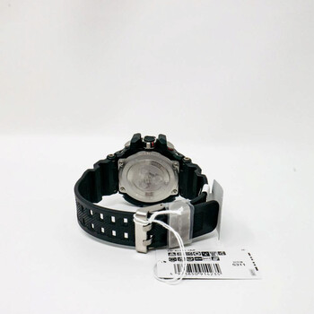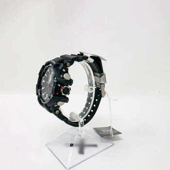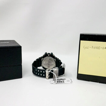 Black stainless steel case with a black rubber strap. Fixed black bezel. Black dial with silver-tone hands and Arabic numeral and index hour markers. Dial Type: Analog. Luminescent hands and markers. Perpetual calendar. Casio Calibre 5311 quartz movement. Scratch resistant sapphire crystal. Solid case back. Round case shape, case size: 54 mm, case thickness: 17.3 mm. Buckle clasp. Water resistant at 200 meters / 660 feet. Functions: perpetual calendar, atomic timekeeping, chronograph, world time, alarm, month, date, day, GMT, second time zone, hour, minute, second, solar-powered, shock resistant. Sport watch style. Watch label: Japan Movt. Pre-owned Casio G-shock Perpetual Alarm World Time Chronograph Black Dial Men's Watch GW-A1100-1AJF.