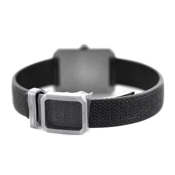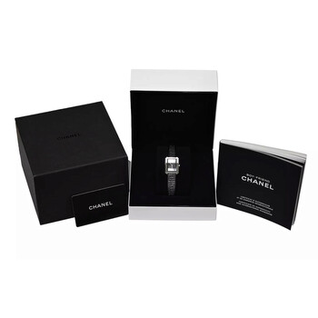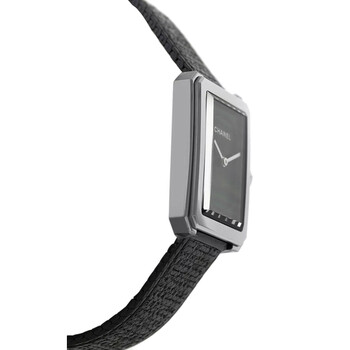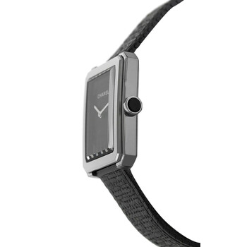 Pre-owned Stainless steel case with a black tweed bracelet. Fixed stainless steel bezel. Black dial with silver-tone hands. No markers. Dial Type: Analog. Quartz movement. Scratch resistant sapphire crystal. Pull / push crown. Solid case back. Case dimensions: 21.5 mm x 27.9 mm. Case thickness: 6.2 mm. Rectangle case shape. Deployment clasp. Water resistant at 30 meters / 100 feet. Functions: hour, minute. Luxury watch style. Chanel Boy-Friend Black Dial Ladies Watch H5317.