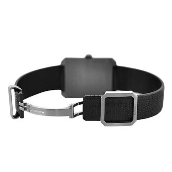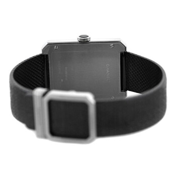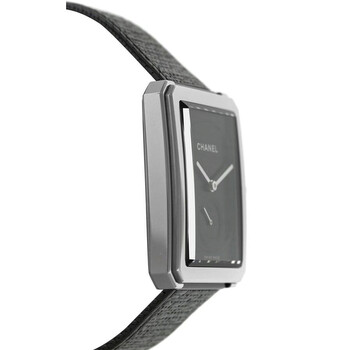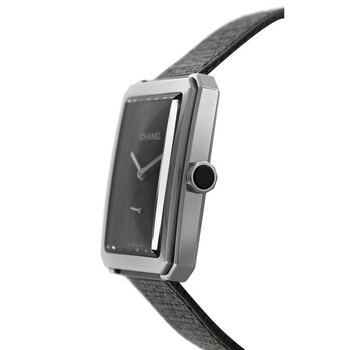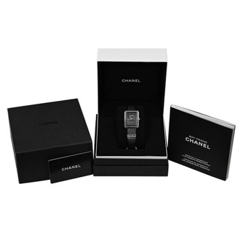 Pre-owned Stainless steel case with a black-plated (tweed motif) stainless steel bracelet. Fixed stainless steel bezel. Black guilloche dial with silver-tone hands. No markers. Dial Type: Analog. One subdial displaying: small seconds. Hand wind movement with a 42-hour power reserve. Scratch resistant sapphire crystal. Pull / push set with a onyx cabochon. crown. Solid case back. Rectangle case shape. Case dimensions: 37 mm x 28.6 mm. Case thickness: 7.7 mm. Fold over clasp. Water resistant at 30 meters / 100 feet. Functions: hour, minute, second. Boy-friend Series. Luxury watch style. Watch label: Swiss Made. Chanel Boy-Friend Black Guilloche Dial Ladies Hand Wound Watch H5201.