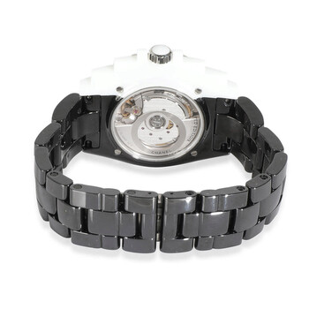 Two-tone (black and white) stainless steel & ceramic case and bracelet. Two-tone (black and white) stainless steel & varnished sapphire crystal bezel. Black dial with silver-tone hands and Arabic numeral hour markers. Minute markers around the outer rim. Dial Type: Analog. Luminescent hands and markers. Kenissi/Chanel Calibre 12.1 Automatic movement, containing 28 Jewels, bitting at 28800 vph, and has a power reserve of approximately 70 hours. Scratch resistant sapphire crystal. Screw down crown. Transparent see through case back. Round case shape, case size: 38 mm, case thickness: 12.60 mm. Band width: 19 mm, band length: 6.75 inches. Fold over clasp with a safety release. Water resistant at 50 meters / 165 feet. Functions: hour, minute, second, chronometer. Additional Info: includes box, papers, instructions. J-12 Series. Sport watch style. Watch label: Swiss Made. Pre-owned Chanel J-12 Automatic Chronometer Crystal Black Dial Unisex Watch H7988.