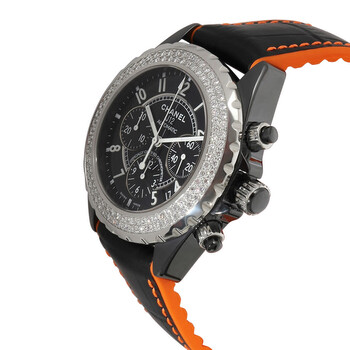 Pre-owned Black ceramic case with a black ceramic bracelet. Unidirectional silver-tone bezel set with 120 diamonds. Black dial with luminous hands and Arabic numeral hour markers. Minute markers around the outer rim. Dial Type: Analog. Luminescent hands and markers. Date display appears between the 4 and 5 o'clock position. Chronograph - three sub-dials displaying: 60 second, 30 minute and 12 hour. Self winding automatic movement with a 21 hour power reserve. Scratch resistant sapphire crystal. Screw down crown. Solid case back. Case diameter: 41 mm. Case thickness: 14 mm. Round case shape. Band width: 20 mm. Band length: 8 inches. Deployment clasp. Water resistant at 200 meters/ 660 feet. Functions: hours, minutes, seconds, calendar, chronograph. Sport watch style. Watch label: Swiss Made. Chanel J12 Black Ceramic Ladies Watch H1009.