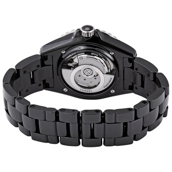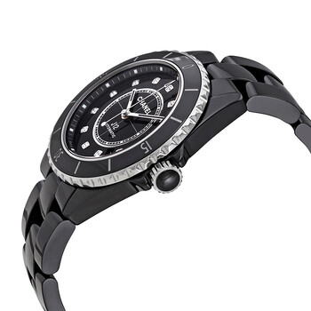 Pre-owned Black (highly resistant) ceramic case and bracelet. Uni-directional rotating black (highly resistant) ceramic bezel with a steel rim. Black dial with silver-tone hands and diamond hour markers. Minute markers around the outer rim. Dial Type: Analog. Date display between 4 and 5 o'clock position. Chanel calibre 12.1 automatic movement. Scratch resistant sapphire crystal. Screw down crown. Transparent case back. Round case shape. Case size: 38 mm. Case thickness: 12.6 mm. Hidden fold over clasp. Water resistant at 200 meters / 660 feet. Functions: date, hour, minute, second. J12 Series. Dress watch style. Watch label: Swiss Made. Chanel J12 Automatic Diamond Black Dial Ladies Watch H5702.