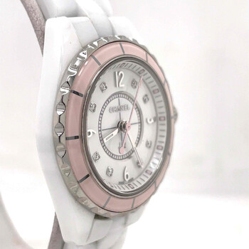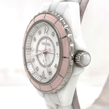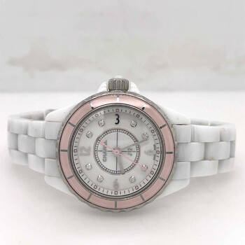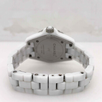 Pre-owned White high-tech ceramic case with a white high-tech ceramic bracelet. Fixed bezel. White dial with silver-tone hands and Arabic-diamond numeral hour markers. Minute markers around the outer rim. Dial Type: Analog. Luminescent hands. Quartz movement. Scratch resistant sapphire crystal. Screw down crown. Solid case back. Case size: 29 mm. Round case shape. Water resistant at 50 meters / 165 feet. Functions: hour, minute, second. Additional Info: limited edition of 1200 pieces. Luxury watch style. Watch label: Swiss Made. Chanel J12 Ladies Watch H4466.