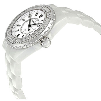 Pre-owned White ceramic case with a ceramic bracelet. Diamond bezel. White dial with luminous hands and Arabic hour markers. Minute markers around the outer rim. Luminescent hands and hour markers. Automatic date between 4 and 5 o'clock. Quartz movement. Scratch resistant sapphire crystal. Case diameter: 33 mm. Hidden deployment clasp. Water resistant at 200 meters / 660 feet. Functions: hours, minutes, seconds, date. Chanel J12 Diamond White Ceramic Ladies Watch H0967.