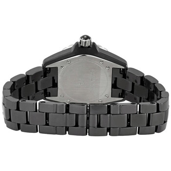 Black tungsten-carbide coated black ceramic case with a black ceramic bracelet. Bi-directional rotating silver-tone stainless steel with a black ceramic inlay bezel. Black dial with luminous hands and diamond hour markers. Minute markers around the outer rim. Dial Type: Analog. Luminescent hands. Date display between 4 and 5 o'clock position. Quartz movement. Scratch resistant sapphire crystal. Screw down crown. Solid case back. Round case shape, case size: 33 mm, case thickness: 9 mm. Band width: 16 mm, band length: 6.5 inches. Hidden deployment clasp. Water resistant at 200 meters / 660 feet. Functions: hours, minutes, seconds, date. J12 Diamonds Series. Sport watch style. Watch label: Swiss Made. Pre-owned Chanel J12 Diamonds Quartz Black Dial Ladies Watch H1625.