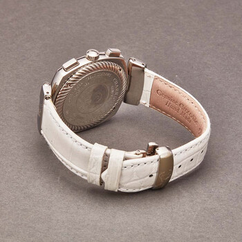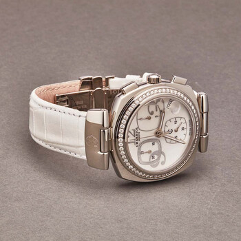 Silver-tone stainless steel case with a white leather strap. Fixed silver-tone stainless steel- diamond set bezel. Mother of pearl dial with silver-tone hands and Arabic numeral hour markers. Dial Type: Analog. Luminescent hands. Date display between 4 and 5 o'clock position. Quartz movement. Scratch resistant sapphire crystal. Pull / push crown. Solid case back. Cushion case shape, case size: 39 mm, case thickness: 12 mm. Deployment clasp. Water resistant at 30 meters / 100 feet. Functions: chronograph, date, hour, minute, second. Dress watch style. Watch label: Swiss Made. Pre-owned Charriol Alexandre Chronograph Quartz Diamond Ladies Watch ALCD.760.003.