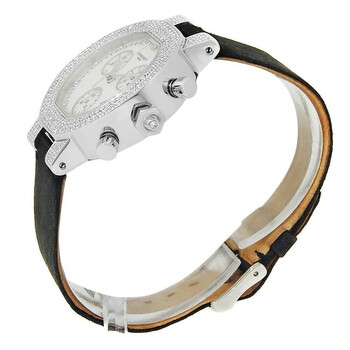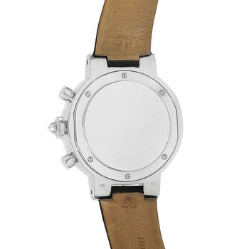 18kt white gold case with a black satin strap. Fixed bezel with diamond set 18kt white gold. Mother of pearl dial with silver-tone hands and diamond hour markers. Minute markers around the outer rim. Dial Type: Analog. Luminescent hands. Date display between 4 and 5 o'clock position. Chronograph - three sub-dials displaying: 60 second, 30 minute and 12 hour. Quartz movement. Scratch resistant sapphire crystal. Solid case back. Round case shape, case size: 41 mm. Buckle clasp. Functions: chronograph, date, hour, minute, second. Chronograph Series. Dress watch style. Watch label: Swiss Made. Pre-owned Chaumet Chronograph Quartz Diamond Ladies Watch CDW.
