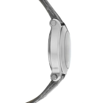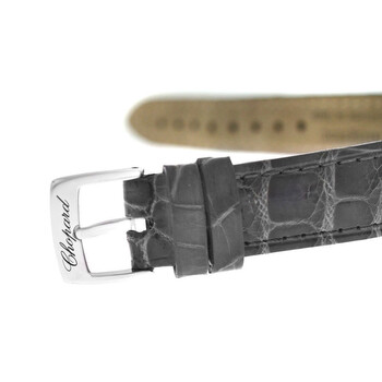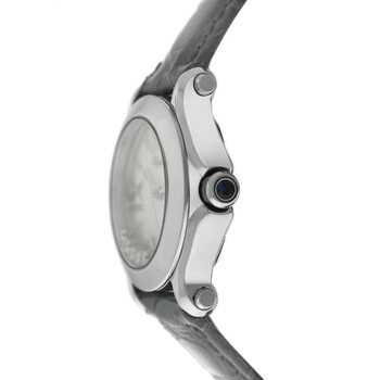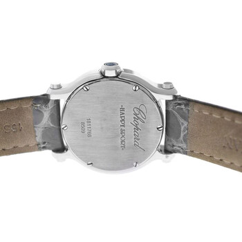 Silver-tone stainless steel case with a black alligator band. Fixed silver-tone stainless steel bezel. Grey dial with silver-tone hands and Roman numeral & index hour markers. Dial Type: Analog. 5 floating diamonds subdials. Quartz movement. Solid case back. Round case shape, case size: 30 mm. Buckle clasp. Functions: hour, minute, second. Happy Sport Series. Casual watch style. Watch label: Swiss Made. Pre-owned Chopard Happy Sport Quartz Grey Dial Ladies Watch 8509.