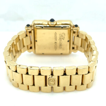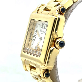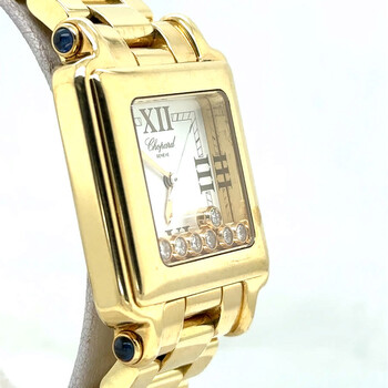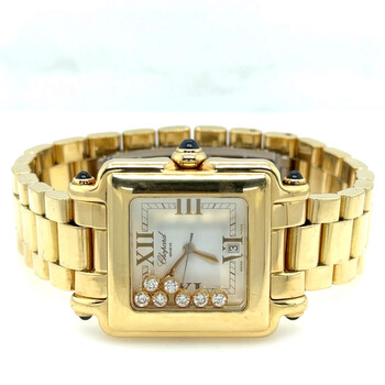 Yellow gold-tone 18kt yellow gold case and bracelet. Fixed yellow gold-tone 18kt yellow gold bezel. White dial with yellow gold-tone hands and Roman & index hour markers. Minute markers around the outer rim. Dial Type: Analog. Date display at the 6 o'clock position. 7 floating diamonds subdials. Quartz movement. Scratch resistant sapphire crystal. Pull / push crown. Solid case back. Square case shape, case size: 27 mm, case thickness: 8 mm. Band width: 15 mm. Hidden clasp. Water resistant at 30 meters / 100 feet. Functions: date, hour, minute, second. Happy Sport Series. Luxury watch style. Watch label: Swiss Made. Pre-owned Chopard Happy Sport Quartz White Dial Ladies Watch 27/6770-23.