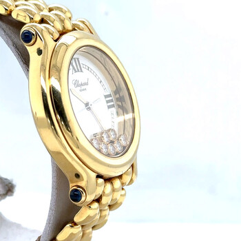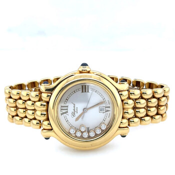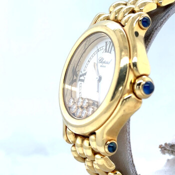 Yellow gold-tone 18kt yellow gold case and bracelet. Fixed yellow gold-tone 18kt yellow gold bezel. White dial with yellow gold-tone hands and Roman numeral & index hour markers. Minute markers around the outer rim. Dial Type: Analog. Date display at the 6 o'clock position. 7 floating diamonds subdials. Quartz movement. Scratch resistant sapphire crystal. Pull / push crown. Solid case back. Round case shape, case size: 33 mm, case thickness: 7 mm. Band width: 16 mm. Hidden clasp. Water resistant at 30 meters / 100 feet. Functions: date, hour, minute, second. Happy Sport Series. Luxury watch style. Watch label: Swiss Made. Pre-owned Chopard Happy Sport Quartz White Dial Ladies Watch 27/6137-23.
