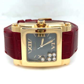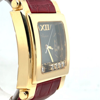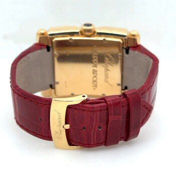 Yellow gold-tone 18kt yellow gold case with a red leather strap. Fixed yellow gold-tone 18kt yellow gold bezel. Black dial with yellow gold-tone hands and Roman & index hour markers. Dial Type: Analog. Date display between 4 and 5 o'clock position. Quartz movement. Scratch resistant sapphire crystal. Pull / push crown. Solid case back. Square case shape, case size: 35 mm, case thickness: 11 mm. Band width: 22 mm. Buckle clasp. Water resistant at 30 meters / 100 feet. Functions: date, hour, minute, second. Happy Sport Square Series. Luxury watch style. Watch label: Swiss Made. Pre-owned Chopard Happy Sport Square Quartz Black Dial Men's Watch 28/73670.