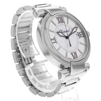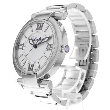 Silver-tone stainless steel case and bracelet. Fixed silver-tone stainless steel bezel. Mother of pearl dial with black hands and Roman numeral hour markers. Minute scale around the inner rim. Dial Type: Analog. Luminescent hands and markers. Date display at the 3 o'clock position. Automatic movement. Scratch resistant sapphire crystal. Solid case back. Round case shape, case size: 40 mm. Fold over clasp with a safety release. Functions: date, hour, minute, second. Imperiale Series. Luxury watch style. Watch label: Swiss Made. Pre-owned Chopard Imperiale Automatic Men's Watch 8531.