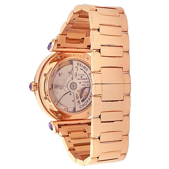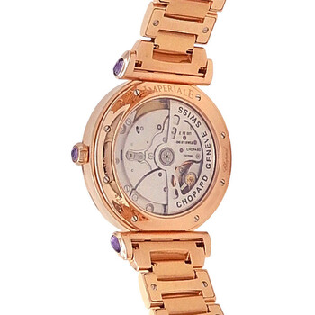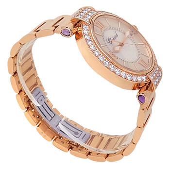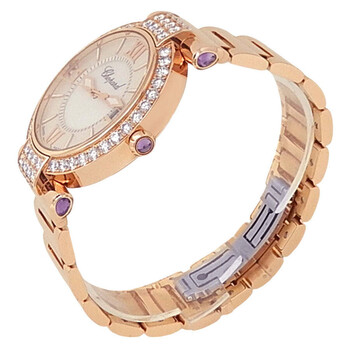 Pre-owned 18kt rose gold case with a 18kt rose gold bracelet. Fixed 18kt rose gold diamond set bezel. Mother of pearl dial with luminous sword-shaped hands and index hour markers. Roman numerals mark the 6, 9, and 12 o'clock position. Dial Type: Analog. Date display at the 3 o'clock position. Chopard Calibre FE 001 Automatic movement, containing 31 Jewels, bitting at 28800 vph, and has a power reserve of approximately 38 hours. Scratch resistant sapphire crystal. Pull / push crown. Solid case back. Round case shape, case size: 40 mm, case thickness: 10.5 mm. Hidden fold over clasp. Water resistant at 50 meters / 165 feet. Functions: date, hour, minute, second. Additional Info: total diamond weight: 3.97 ct. Imperiale Series. Luxury watch style. Watch label: Swiss Made. Item Variations: 384241 5004, 384241.5004, 3842415004. Chopard Imperiale Mother of Pearl Diamond 18kt Rose Gold Ladies Watch 384241-5004.