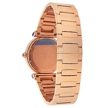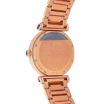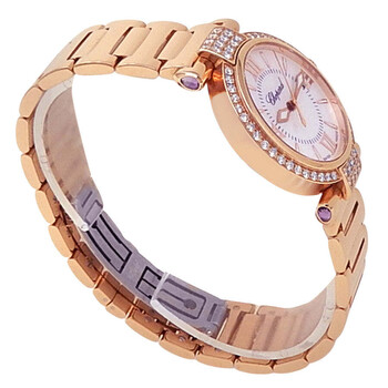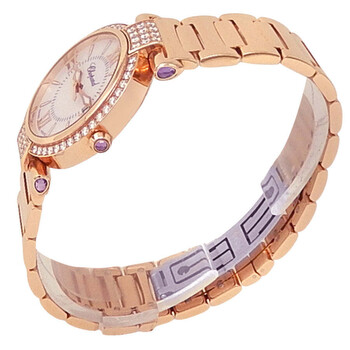 Pre-owned 18 kt rose gold case with a 18 kt rose gold bracelet. Fixed 18 kt rose gold bezel set with 60 diamonds. Mother of pearl dial with rose gold-tone hands and stick hour markers. Roman numerals mark the 3, 6, 9 and 12 o'clock positions. Minute markers around an inner ring. Dial Type: Analog. Luminescent hands and markers. Date display appears at the 3 o'clock position. Quartz movement. Scratch resistant sapphire crystal. Solid case back. Case diameter: 28 mm. Case thickness: 9 mm. Round case shape. Deployment clasp with push button. Water resistant at 50 meters / 165 feet. Functions: date, hour, minute, second. Luxury watch style. Watch label: Swiss Made. Chopard Imperiale Diamond Mother of Pearl Dial 18 kt Rose Gold Ladies Watch 384238-5004.