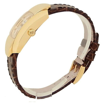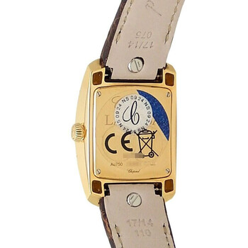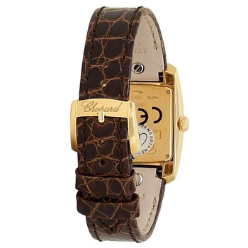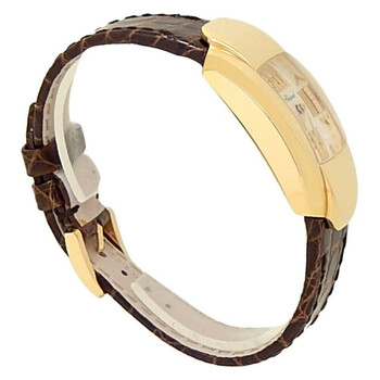 Yellow gold-tone 18kt yellow gold case with a brown leather strap. Fixed yellow gold-tone 18kt yellow gold bezel. Silver-tone dial with yellow gold-tone hands and Roman numeral hour markers. Minute markers around the outer rim. Dial Type: Analog. Quartz movement. Scratch resistant sapphire crystal. Solid case back. Unique case shape, case size: 26 mm x 45 mm. Band width: 17 mm. Buckle clasp. Water resistant at 30 meters / 100 feet. Functions: hour, minute, second. La Strada Series. Dress watch style. Watch label: Swiss Made. Pre-owned Chopard La Strada Quartz Silver Dial Ladies Watch 419255-0001.