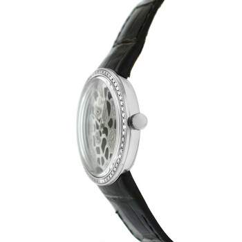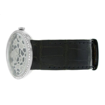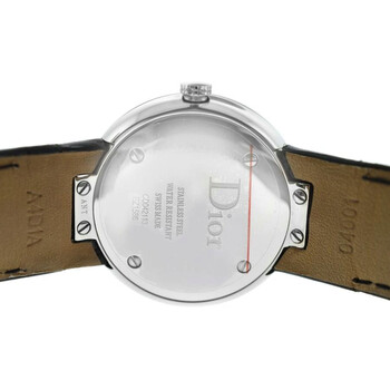 Silver-tone stainless steel case with a black leather strap. Fixed silver-tone bezel with diamond set stainless steel. Black dial with silver-tone hands and diamond hour markers. Dial Type: Analog. Quartz movement. Scratch resistant sapphire crystal. Solid case back. Round case shape, case size: 33 mm. Tang clasp. Functions: hour, minute. La D De Dior Series. Casual watch style. Watch label: Swiss Made. Pre-owned Christian Dior La D De Dior Quartz Diamond Black Dial Ladies Watch CD042113.