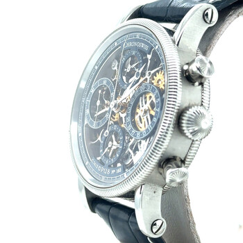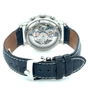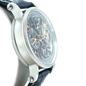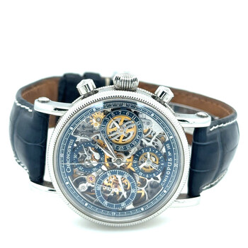 Silver-tone stainless steel case with a blue leather strap. Fixed silver-tone stainless steel bezel. Transparent dial with silver-tone hands and index hour markers. Minute markers around the outer rim. Dial Type: Analog. Date display at the 3 o'clock position. Automatic movement. Scratch resistant sapphire crystal. Pull / push crown. Transparent case back. Round case shape, case size: 38 mm, case thickness: 14 mm. Band width: 20 mm. Buckle clasp. Water resistant at 30 meters / 100 feet. Functions: date, hour, minute, second, month, chronograph, chronometer. Opus Series. Luxury watch style. Watch label: Swiss Made. Pre-owned ChronoSwiss Opus Chronograph Automatic Chronometer Men's Watch CH 7523 S.