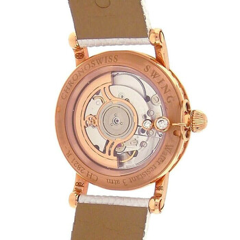 Rose gold-tone 18kt rose gold case with a white genuine leather strap. Fixed rose gold-tone 18kt rose gold bezel. White mother of pearl dial with rose gold-tone hands and Arabic numeral hour markers. Dial Type: Analog. Date display at the 3 o'clock position. Automatic movement. Scratch resistant sapphire crystal. Pull / push crown. Transparent see through case back. Round case shape, case size: 38 mm. Buckle clasp. Water resistant at 30 meters / 100 feet. Functions: date, hour, minute, second. Swisng Series. Dress watch style. Watch label: Swiss Made. Pre-owned ChronoSwiss Swisng Automatic Ladies Watch CH 2821LLRSW. Box: No ,Paper: No