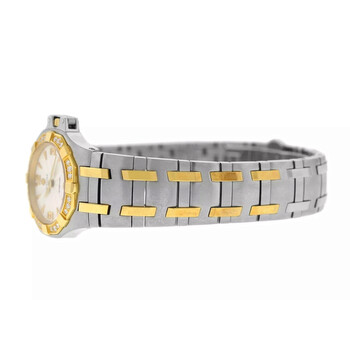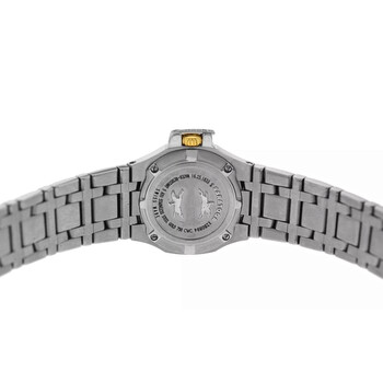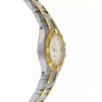 Silver-tone stainless steel case with a two-tone (silver-tone and yellow gold-tone) 18kt yellow gold and stainless steel bracelet. Fixed yellow gold-tone bezel with diamond set 18kt yellow gold. White dial with yellow gold-tone hands and Arabic numeral & index hour markers. Dial Type: Analog. Quartz movement. Solid case back. Round case shape, case size: 25 mm. Fold over clasp with a safety release. Water resistant at 50 meters / 165 feet. Functions: hour, minute. Concord Saratoga Series. Luxury watch style. Watch label: Swiss Made. Pre-owned Concord Concord Saratoga Quartz Diamond White Dial Ladies Watch 16.25.1833S.