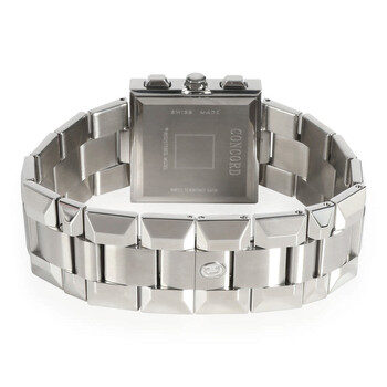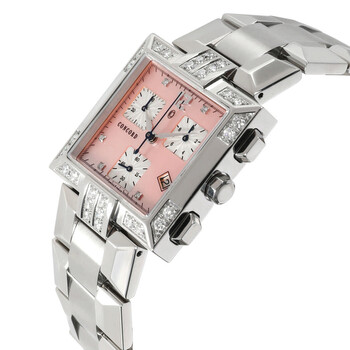 Silver-tone stainless steel case and bracelet. Fixed silver-tone bezel with diamond set stainless steel. Pink dial with silver-tone hands and diamond hour markers. Minute markers around the outer rim. Dial Type: Analog. Date display at the 4 o'clock position. Quartz movement. Scratch resistant sapphire crystal. Solid case back. Square case shape, case size: 30.0 mm, case thickness: 9 mm. Band width: 21.5 mm, band length: 7.25 inches. Hidden clasp. Functions: chronograph, date, hour, minute, second. La Scala Series. Sport watch style. Watch label: Swiss Made. Pre-owned Concord La Scala Chronograph Quartz Diamond Pink Dial Ladies Watch 14.H1.1371S.