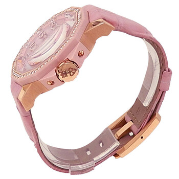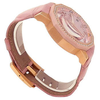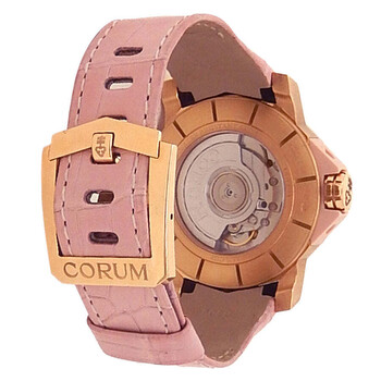 Pre-owned 18kt rose gold case with a crocodile leather strap. Fixed bezel. Rose dial with rose gold-tone hands and Roman numeral hour markers. Minute markers around the outer rim. Dial Type: Analog. Date display at the 3 o'clock position. Corum Calibre CO 082 automatic movement with a 42-hour power reserve. Scratch resistant sapphire crystal. Case size: 40 mm. Case thickness: 11.8 mm. Dodecagonal case shape. Fold over clasp. Water resistant at 50 meters / 165 feet. Functions: date, hour, minute, second. Luxury watch style. Watch label: Swiss Made. Corum Admirals Cup Competition Automatic Ladies Watch 082.952.85/0088 PN31.